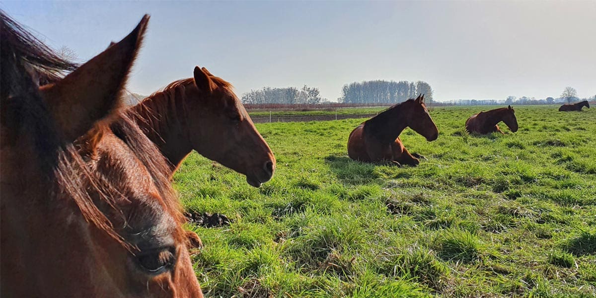 Die Schulpferde leben als Herde in einem Offenstall und können im Sommer herrlich viel Zeit auf der Weide verbringen.